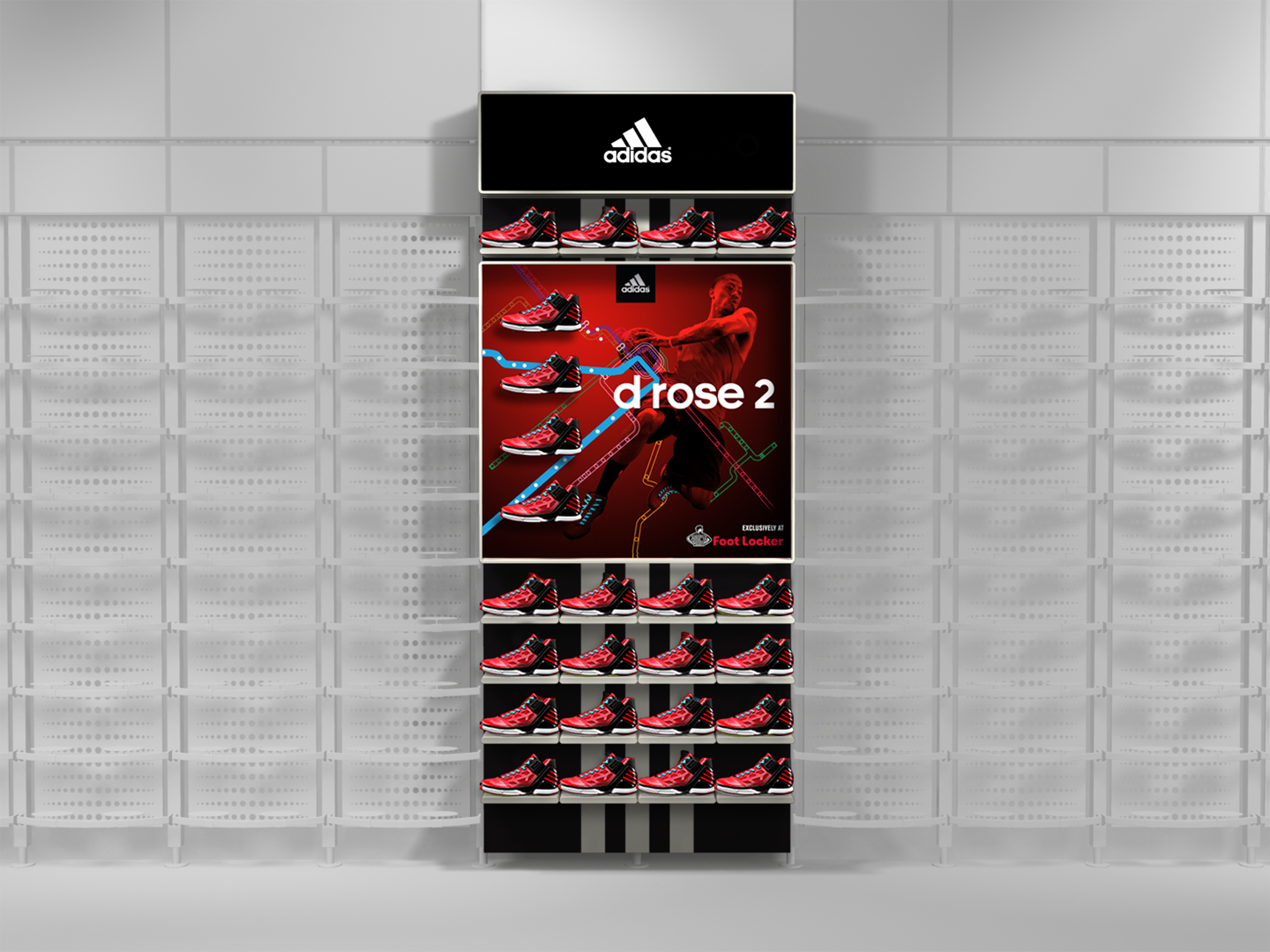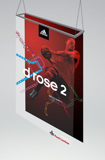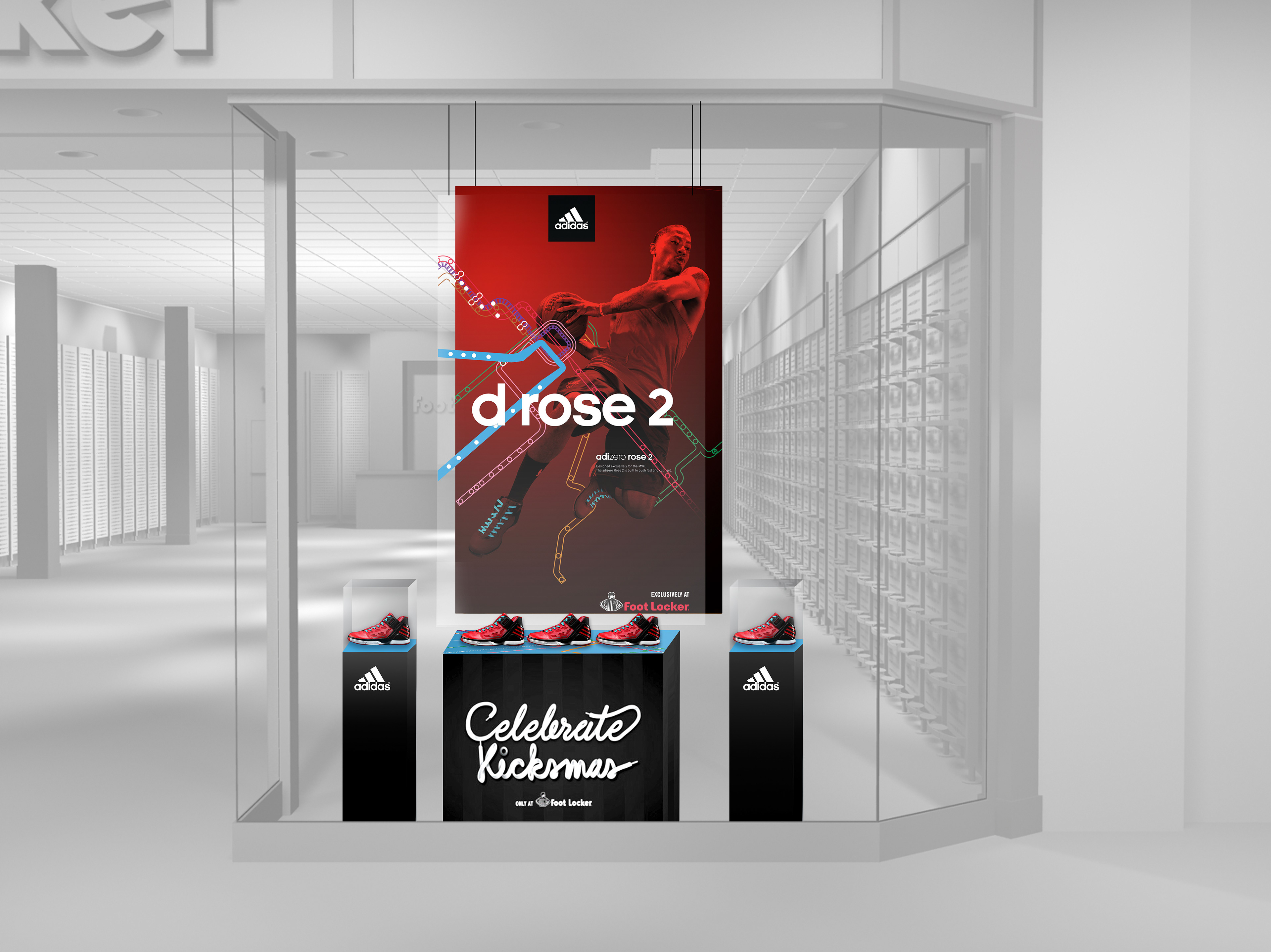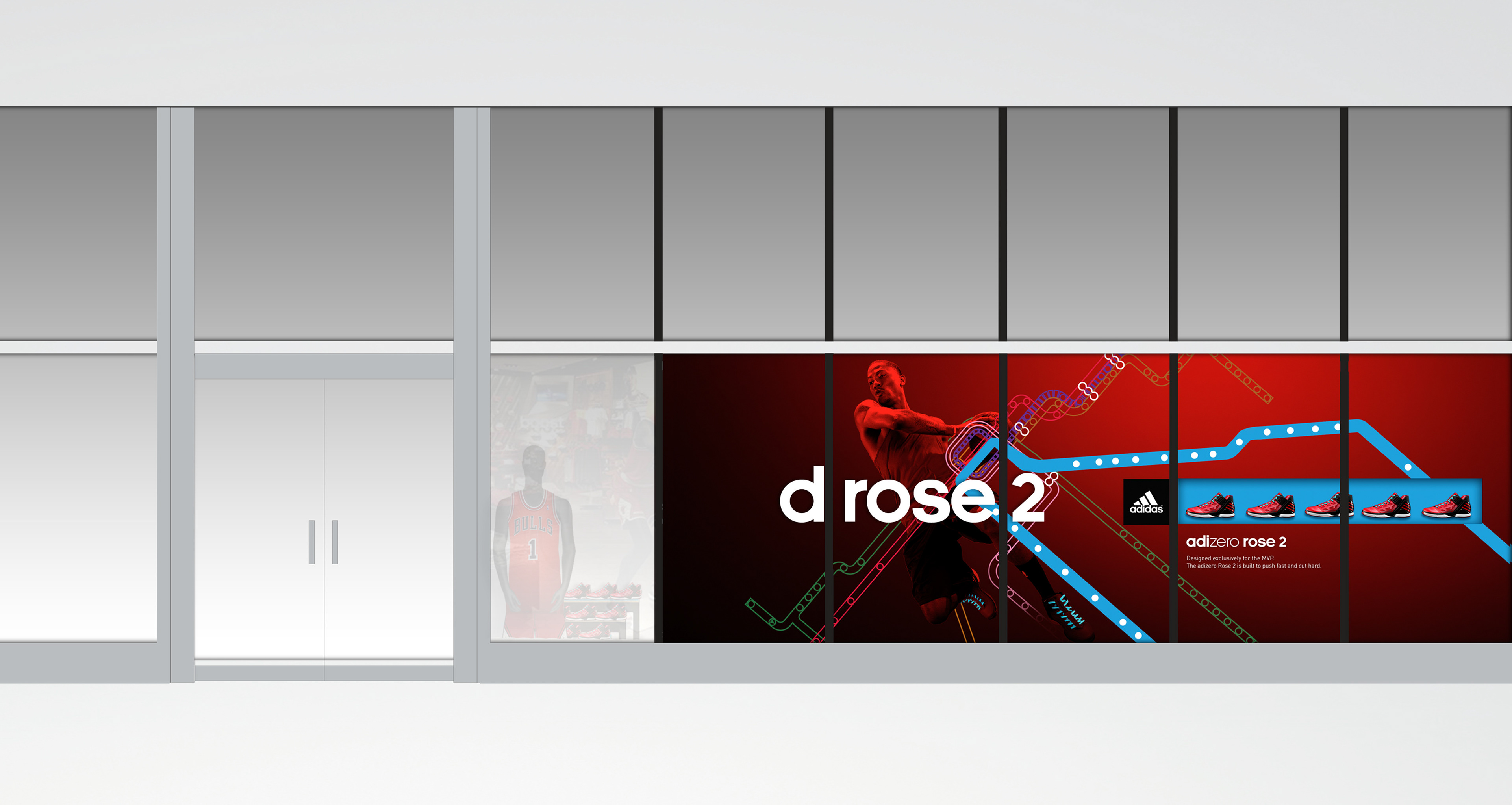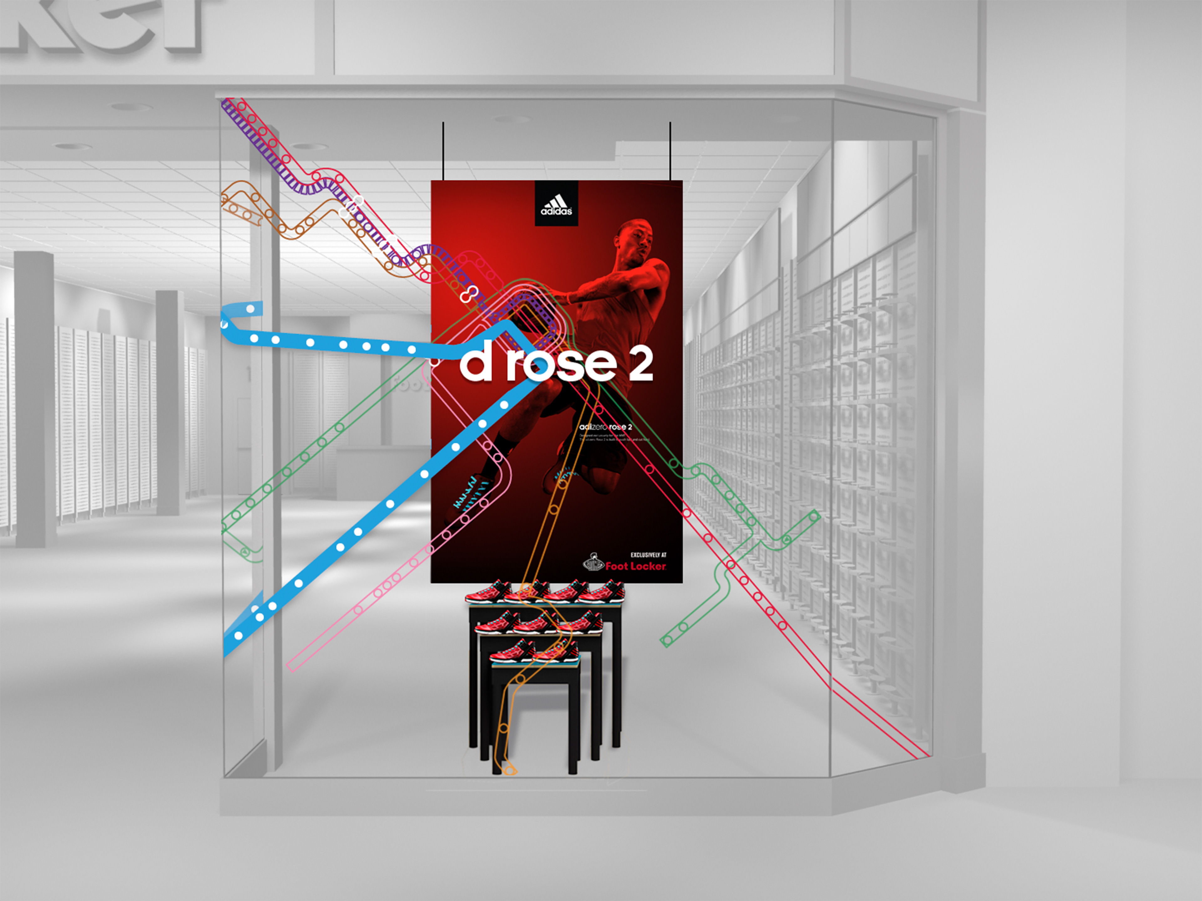 Retail windows designed to promote the L-Train version of the D Rose 2 shoe for Footlocker.