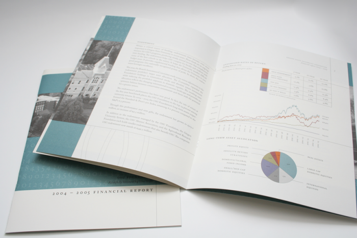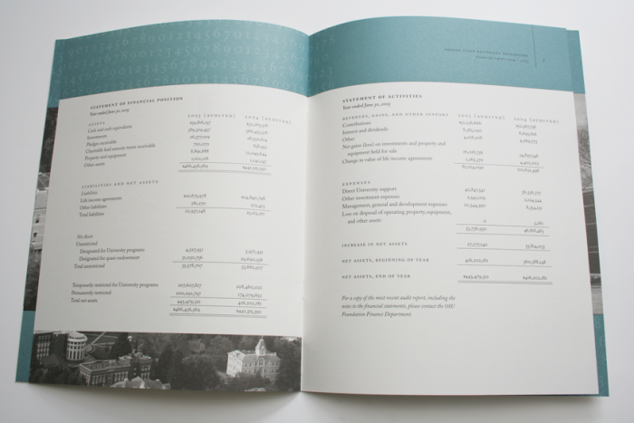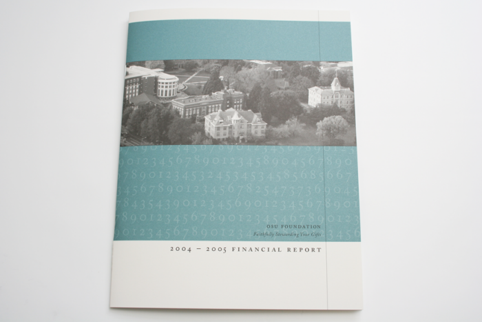 Financial Report for Oregon State University Foundation. Saddle stitch brochure with 2 PMS colors plus 4 additional PMS color on one spread.
